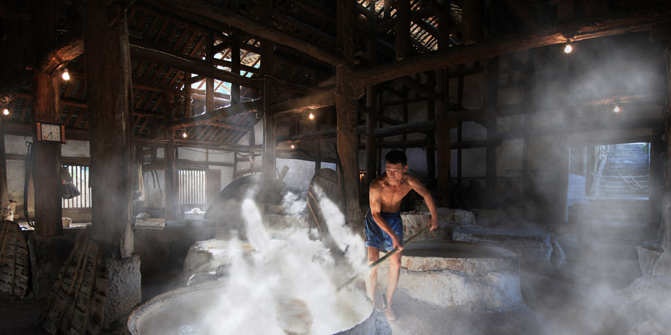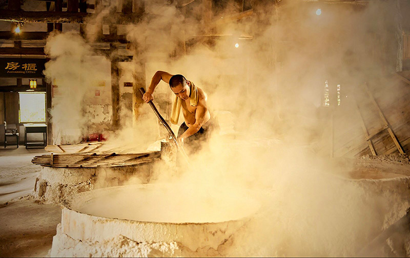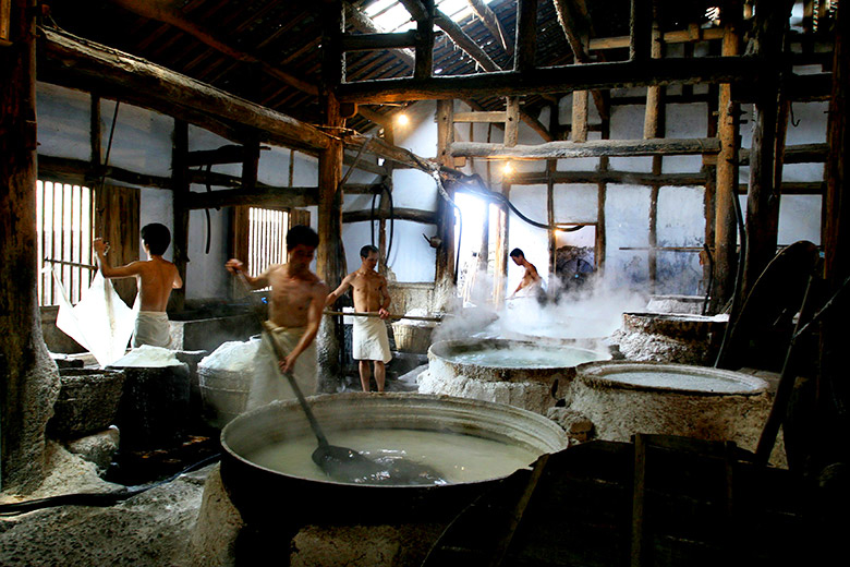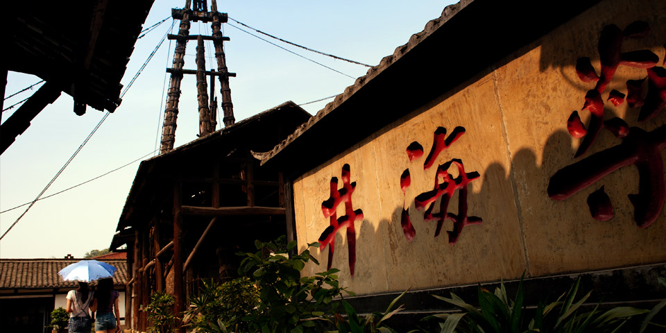 现存燊海井占地面积6000平方米左右,保留着十九世纪初的布局和风貌,是一处典型的清代井盐生产现场。跨门入内,左侧是高为十八点四米的井架和碓房,右侧为推汲卤水的大车房。从碓房和大车房之间拾级而上,是采用传统的煎制方法生产食盐的灶房,以及柜房和盐仓。